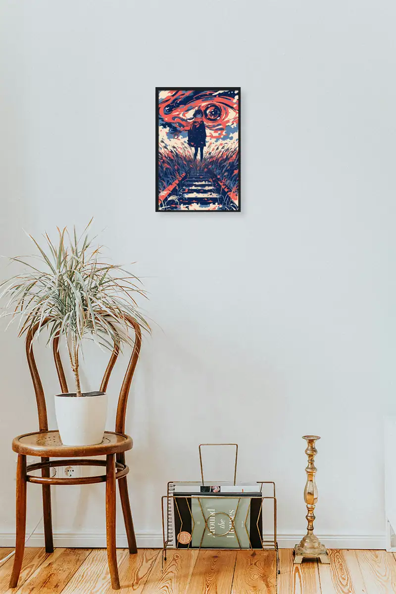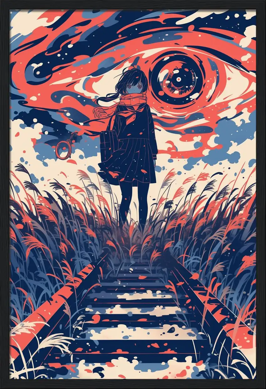 A captivating piece of digital art featuring a young anime girl standing before a massive, swirling eye. This piece evokes feelings of mystery, introspection, and the unknown. Perfect for fans of anime, surreal art, and emotional visuals.