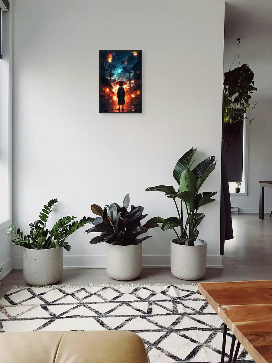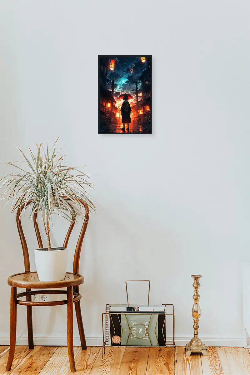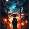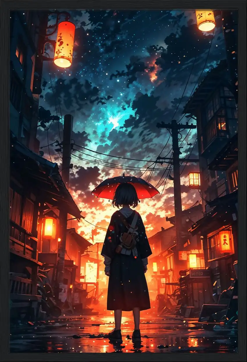 A captivating anime artwork depicting a girl with an umbrella in a vibrant, cosmic city setting. Perfect for adding a touch of anime-inspired fantasy to your space.