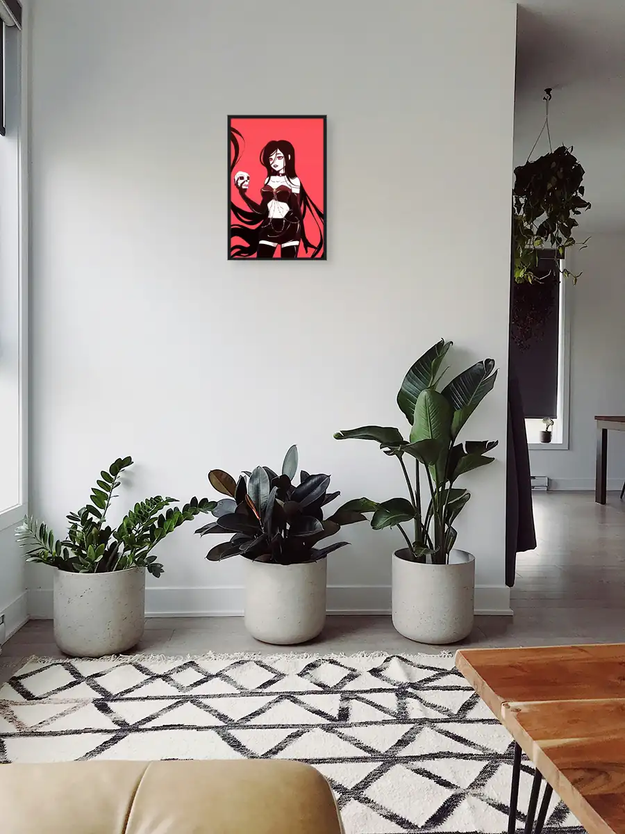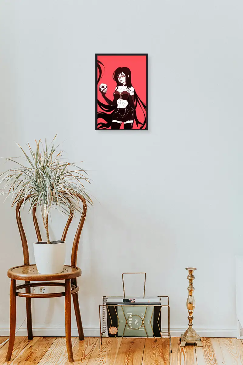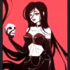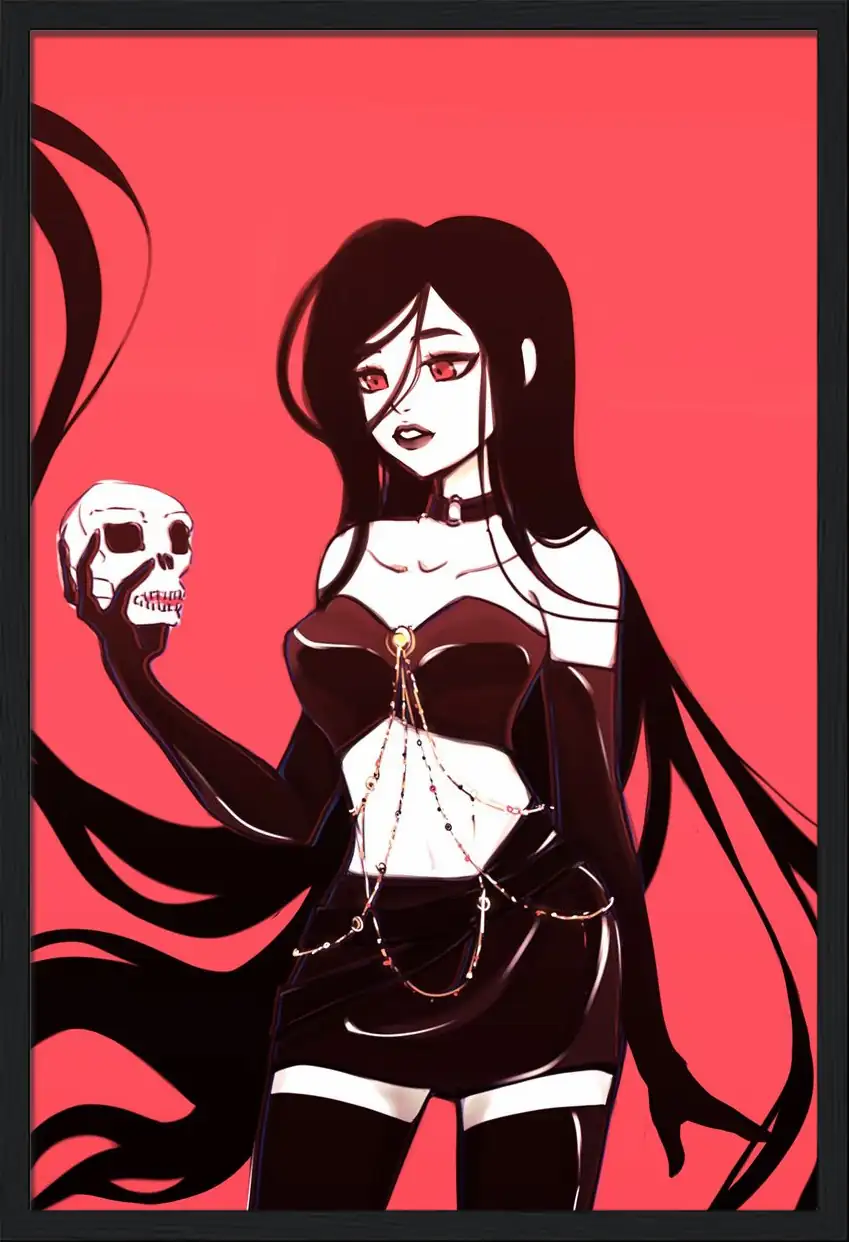 A captivating illustration of a gothic anime girl, holding a skull, against a vibrant red backdrop. Perfect for fans of anime, gothic art, and dramatic storytelling.