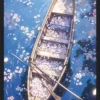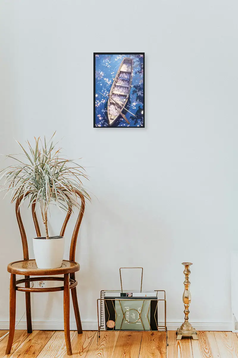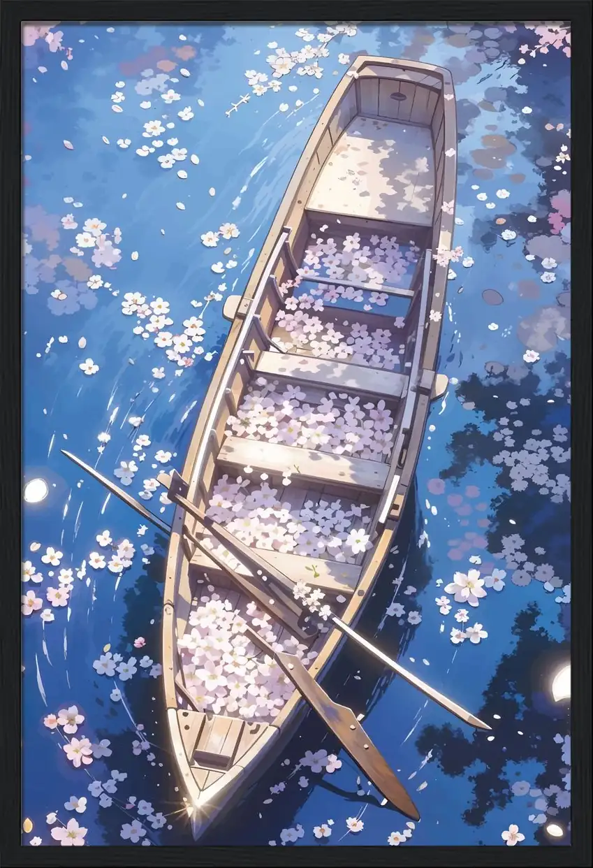 Experience the enchanting beauty of this anime-style artwork. A serene scene of a boat adrift on a tranquil lake, adorned with delicate cherry blossoms. Perfect for adding a touch of peaceful elegance to your space.