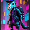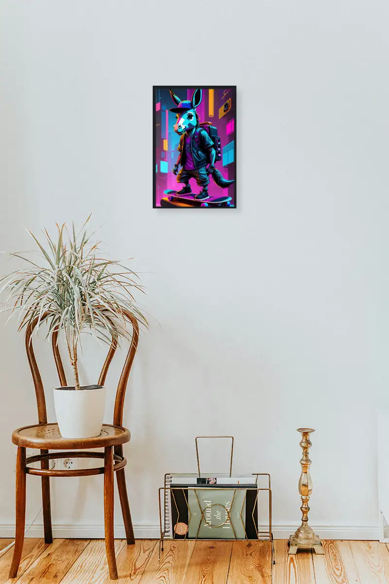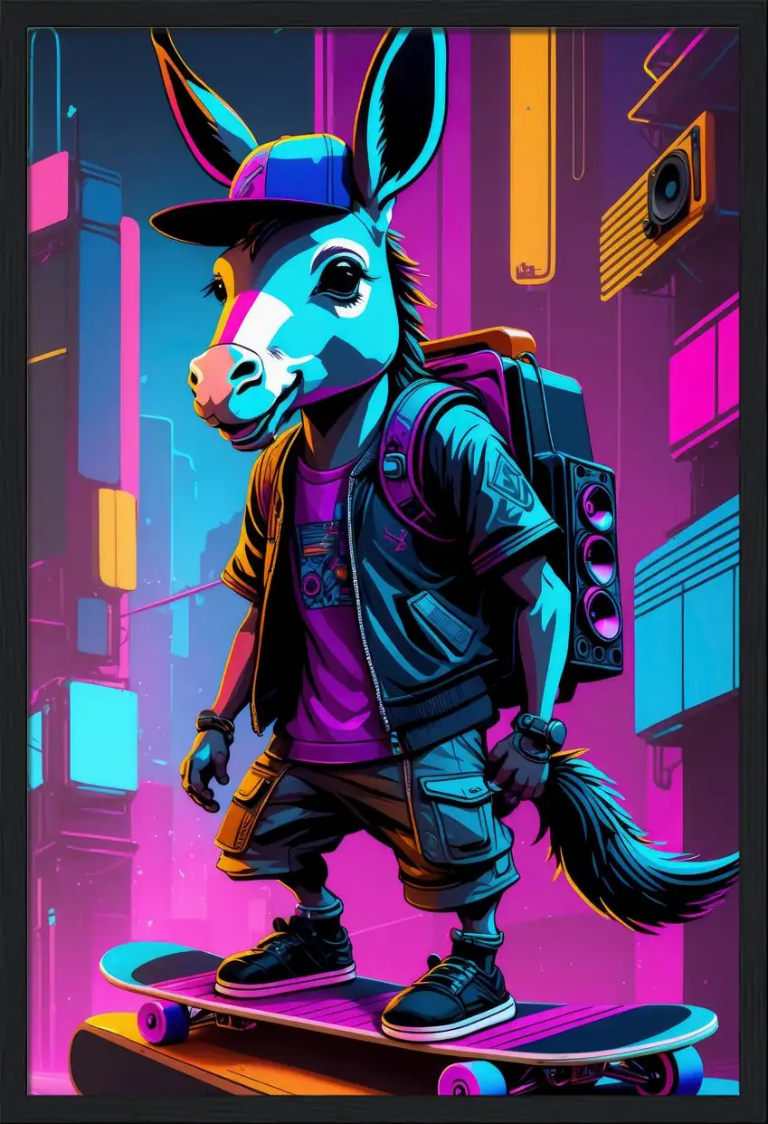 Vibrant 80s-inspired artwork featuring a stylish donkey skateboarding through a neon-lit city. A perfect piece for adding a unique and energetic vibe to any space.
