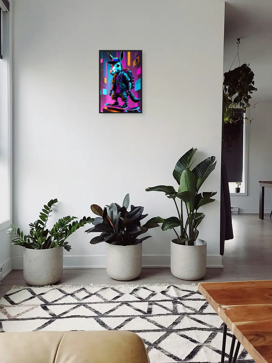 Neon City Donkey Skateboarding Art Print – Premium Wooden Framed Poster. Ready to Hang.